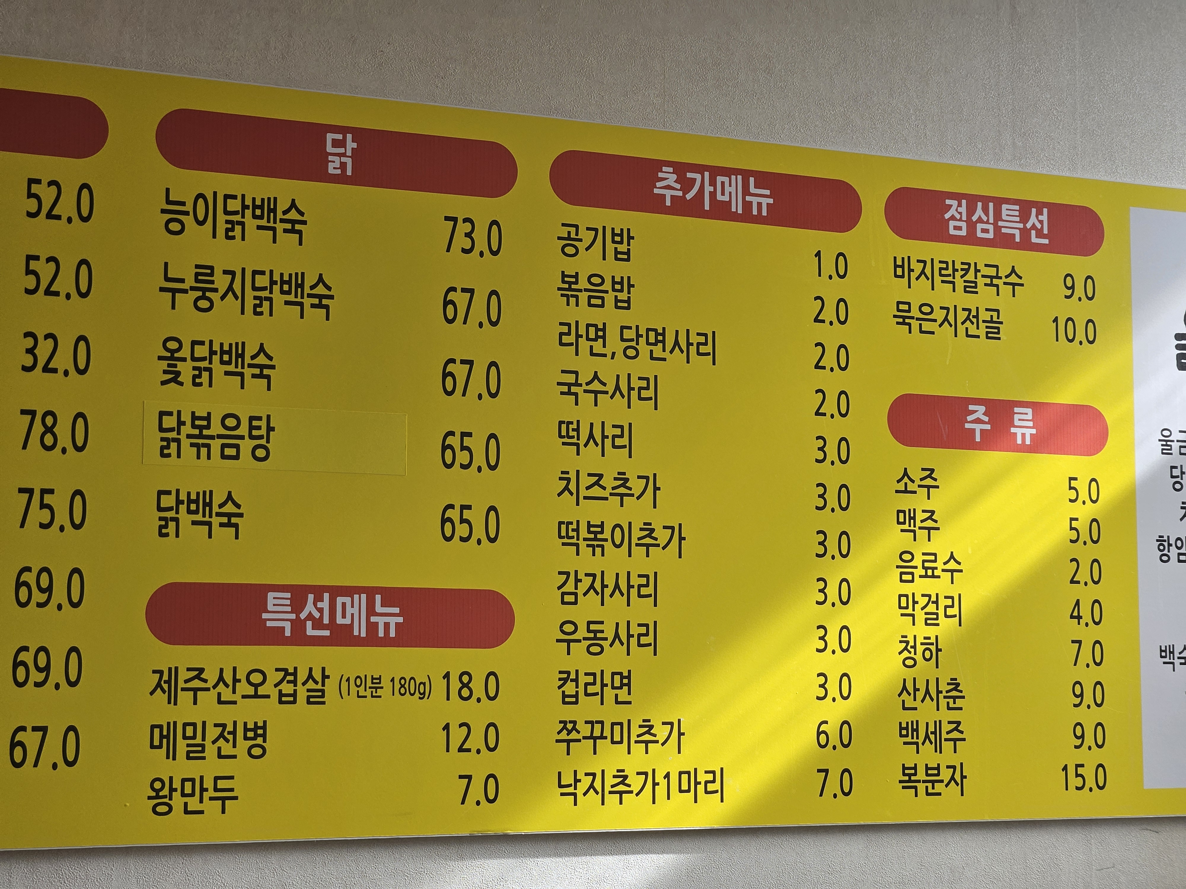 추가메뉴 또한 볶음밥 등 많은 사리 메뉴도 있었어요. 점심 특선에는 칼국수와 묵은지 전골도 보이네요