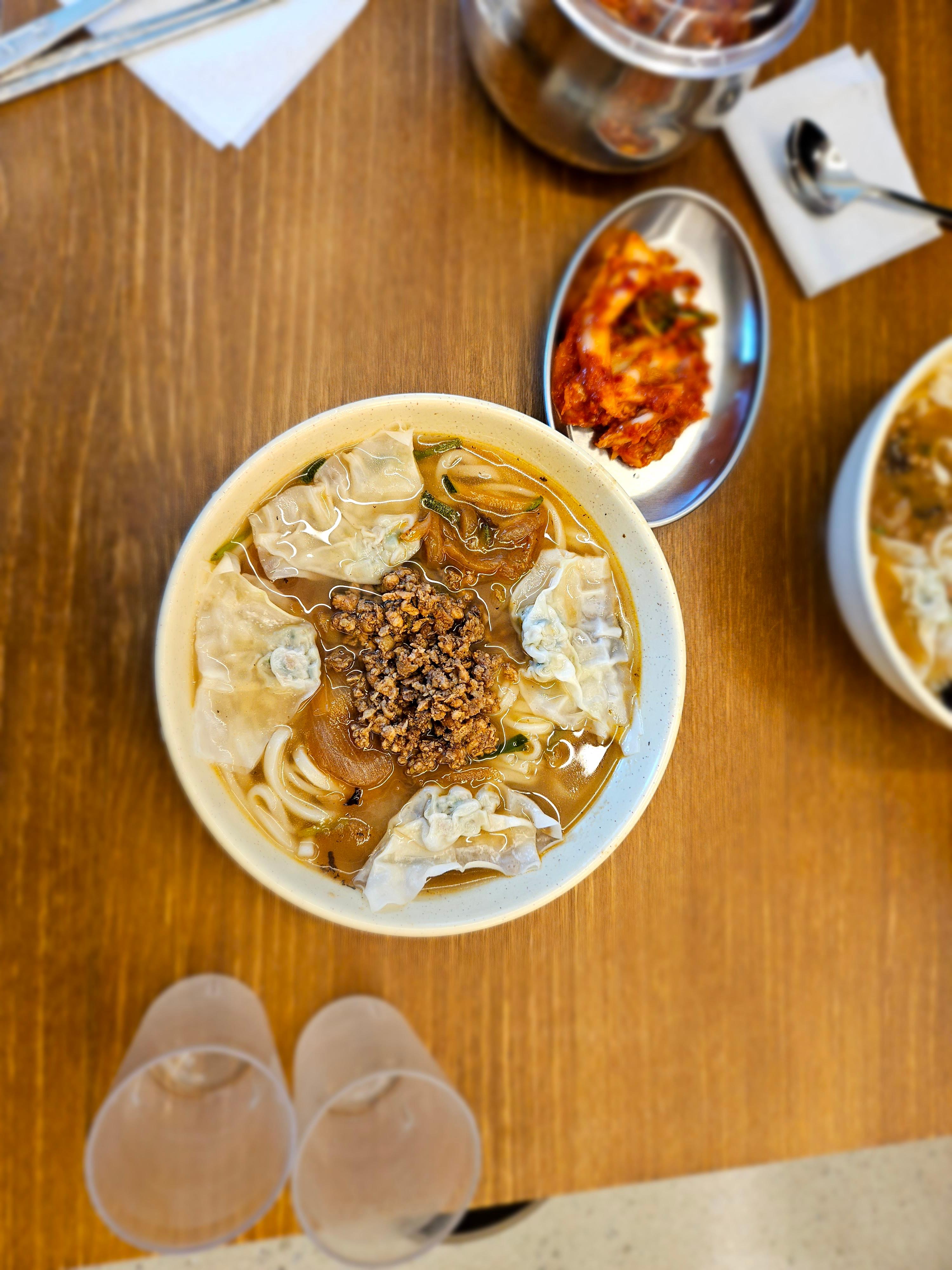 드디어 시식! 국물먼저 먹어봤는데 약간 짬뽕 불맛?이 느껴졌고 굉장히 신선한 맛이었다. 교자가 유명해서 그런지 칼국수 안에 만두가 들어가있음. 김치는 직접 담구시는지 짭쪼름한게 맛있었고 맵기는 좀 매운편이었다.
